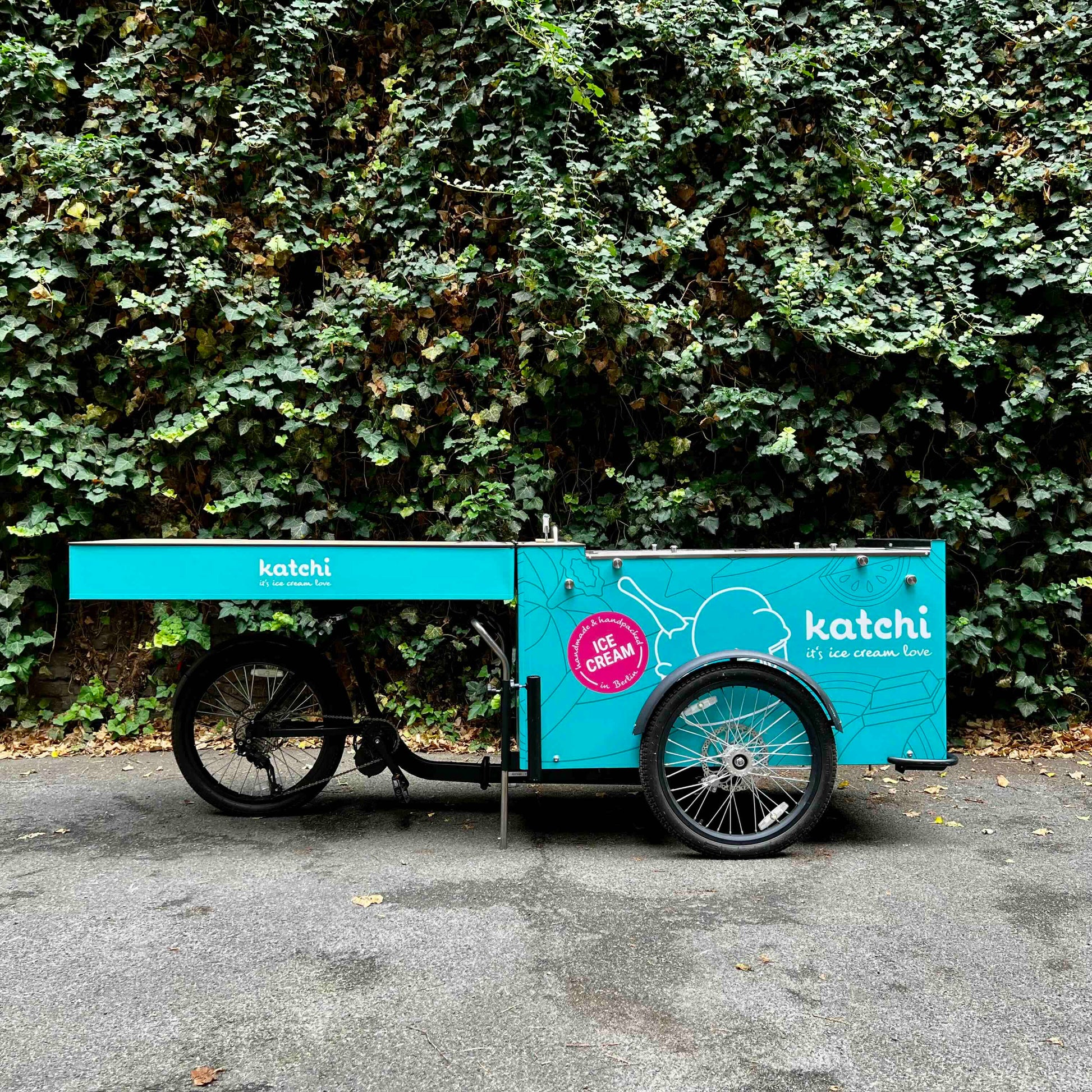 Our ice cream catering packages with the “Square” bike are designed to turn your event into a memorable experience. We arrive with the bike fully stocked, staffed by our friendly Katchi team, ready to serve up to 6 different ice cream flavours at once. You can choose from our wide range of vegan ice cream, dairy ice cream, and gluten-free flavours – all made with premium ingredients and often featuring our signature homemade gluten-free cookies.